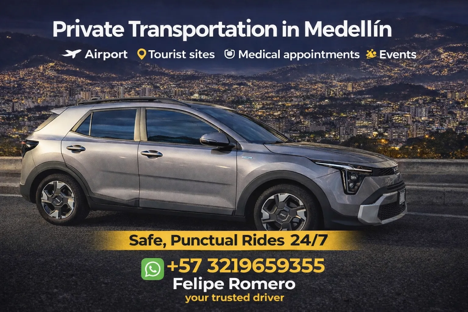 âś” Recogidas y entregas en el aeropuerto (Rionegro – MedellĂn)âś” Viajes por la ciudad (El Poblado, Laureles, centro y más)âś” Reservas por horas o dĂasâś” Servicio personalizado para turistas
